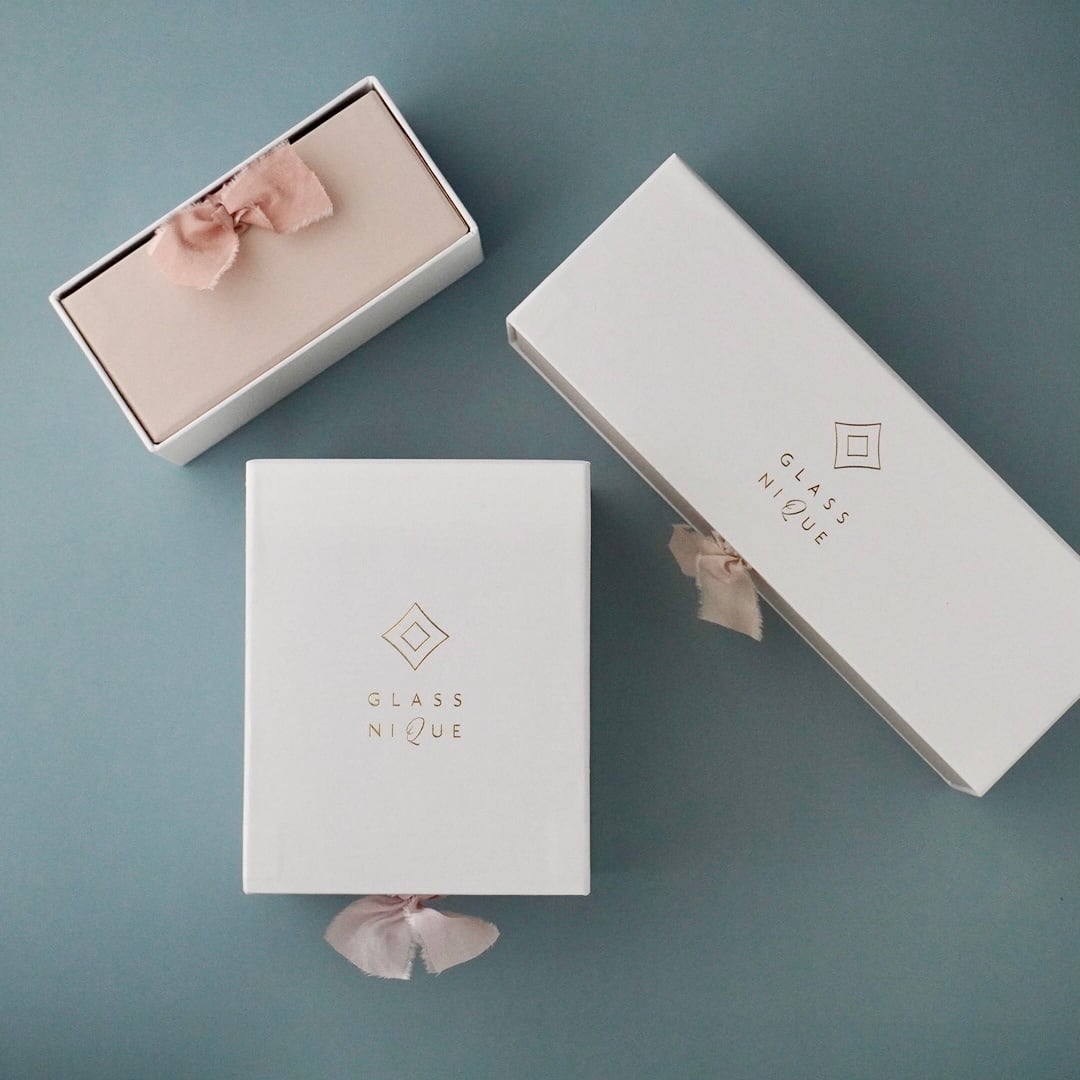 ・BOXはそのままギフトでお渡しいただけるよう、シルクのリボンがついた高級感のある引き出しタイプになっております。GlassNiqueのロゴがゴールドの箔押しで刻印されています。